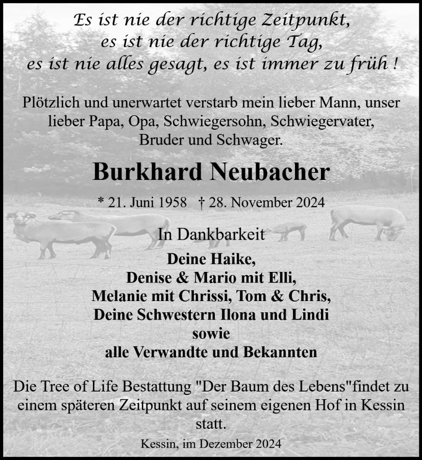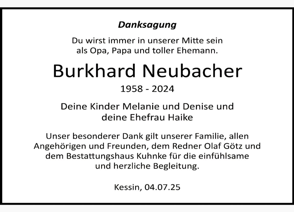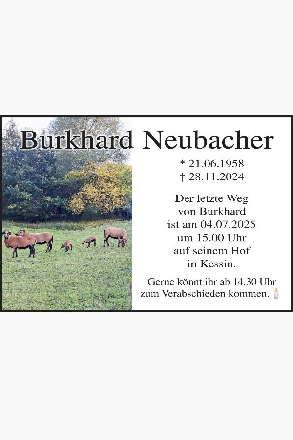 Der letzte Weg von Burkhard Neubacher ist am 04.07.25 um 15 Uhr auf seinem Hof in Kessin(Neubrandenburger Str. 21).