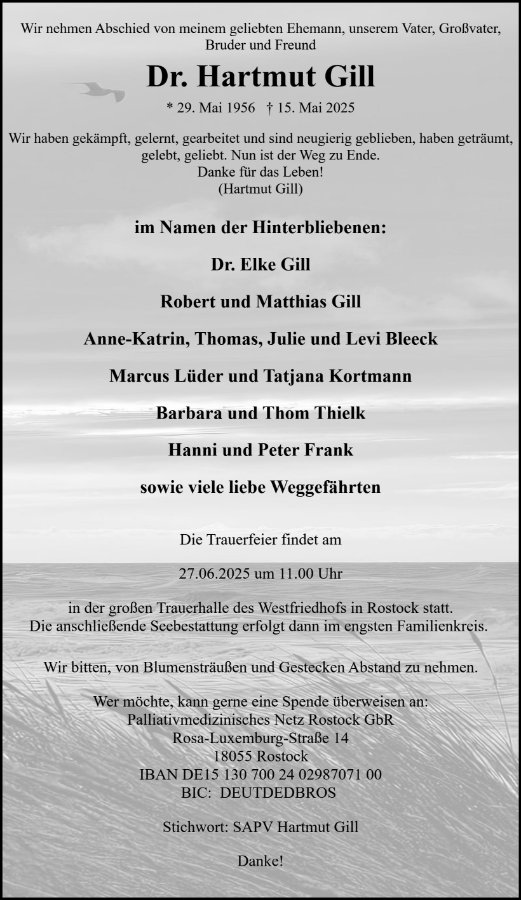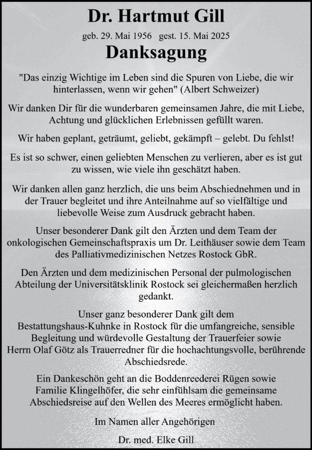 Dein geliebter Mann ist von Dir gegangen. In tiefem Mitgefühl begleiten Dich unsere Gedanken. Wir werden Hartmut immer als liebenswerten Menschen und äußerst geschätzten ärztlichen Kollegen in Erinnerung behalten.