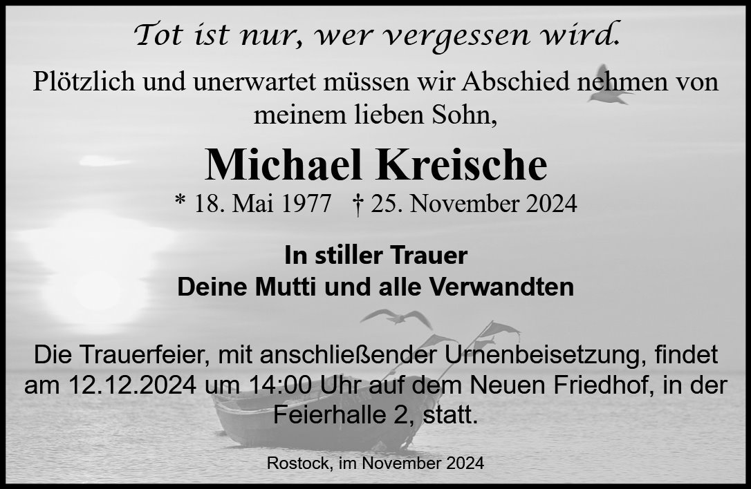 Lieber Michael, Du bist viel zu früh gegangen, wir trauern um Dich Annett und Roswitha, Deiner Mutter geben wir viel Kraft und Trost, du fehlst Allen die Dich kannten